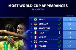 各国参加世界杯次数:巴西23次最多,德国21次、阿根廷19次前三